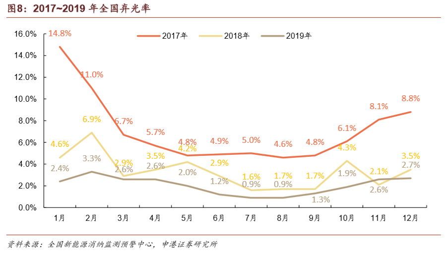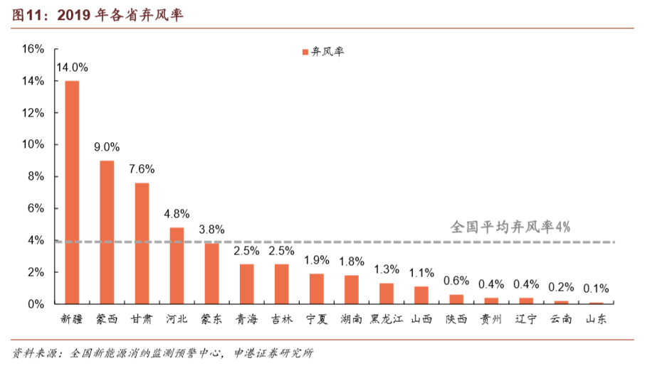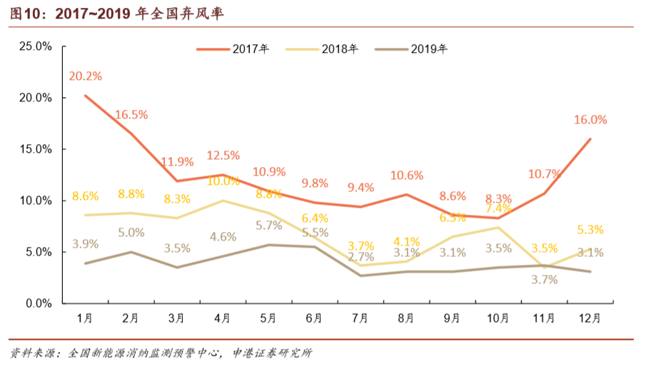 上一輪搶裝期過后,風(fēng)電場的并網(wǎng)需求遠(yuǎn)高于電網(wǎng)的消納能力,導(dǎo)致棄風(fēng)率在2016年達(dá)到高點(diǎn)。在風(fēng)電投資預(yù)警監(jiān)測機(jī)制的限制下,諸多已核準(zhǔn)項(xiàng)目陷入冷凍期。在經(jīng)歷了2015年15%、2016年17.1%的棄風(fēng)率高峰之后,棄風(fēng)率已連續(xù)三年實(shí)現(xiàn)下降,2019年實(shí)現(xiàn)棄風(fēng)率4%,同比降低3 pct,繼續(xù)保持即可滿足2020年棄風(fēng)率要求。