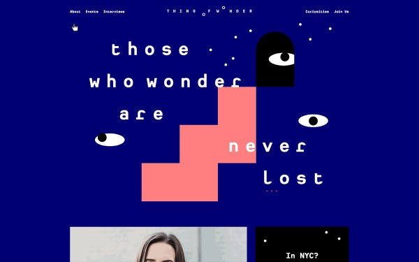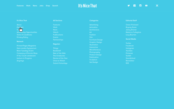 這不是某一種類別的導航,而是一系列的導航方式。往往用在作品集網(wǎng)站上,設(shè)計師可以天馬行空發(fā)揮創(chuàng)意。這種導航的特點往往是拋棄傳統(tǒng)導航,把導航欄里的條目拆分到頁面各處。角落往往是最受歡迎的。