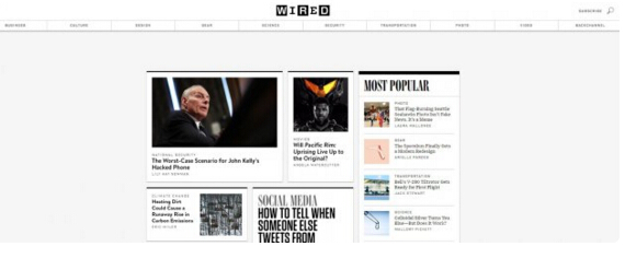 突出品牌的方式有很多,內(nèi)容是其中很重要的部分,同時視覺和體驗也不容忽略。比如在技術類數(shù)字雜志中極為出名的 Wired ,也就是《連線》雜志。獨樹一幟的 LOGO,黑白分明的配色融入整個數(shù)字雜志的網(wǎng)站設計,和 LOGO 以及品牌本身遙相呼應。