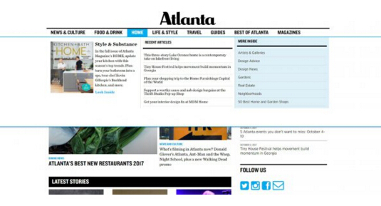 Atlanta Magazine 的大型導航菜單給人的體驗就非常流暢,下拉菜單中嵌入了大量的鏈接。由于響應式的滑動導航在移動端上也已經(jīng)很常見了,這使得它還輕松兼顧到了移動端的設計。