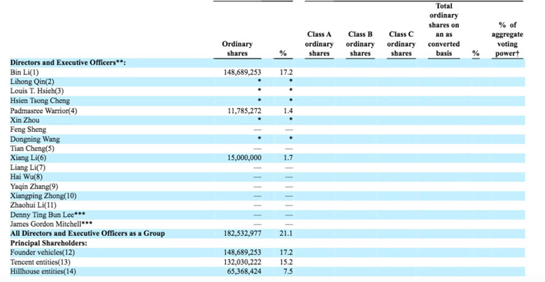 招股書(shū)顯示,IPO前,蔚來(lái)汽車(chē)的前三大股東分別為公司創(chuàng)始人、董事長(zhǎng)李斌(持股17.2%),騰訊(持股15.2%)和高瓴資本(持股7.5%)。另外,蔚來(lái)汽車(chē)北美CEO Padmasree Warrior 持股1.4%,車(chē)和家創(chuàng)始人李想持股1.7%。