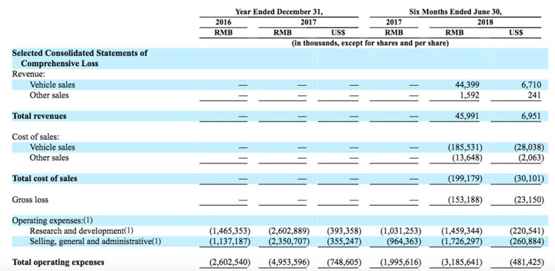 從財(cái)務(wù)成績(jī)來(lái)看,截至2018年6月30日,蔚來(lái)汽車(chē)2018年前6個(gè)月的營(yíng)收約為695萬(wàn)美元(約合4600萬(wàn)人民幣);其中汽車(chē)銷(xiāo)售收入為671萬(wàn)美元(約合4440萬(wàn)人民幣)。不過(guò),和公司的虧損相比,這些營(yíng)收簡(jiǎn)直是杯水車(chē)薪。招股書(shū)顯示,蔚來(lái)汽車(chē)2016年、2017年和2018年上半年的虧損分別為26億元、49.5億元和31.9億元。截至2018年6月30日,蔚來(lái)汽車(chē)的賬上還有44.8億人民幣現(xiàn)金。